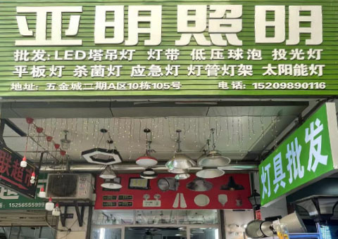 合肥亚明照明位于安徽省合肥市安徽五金机电商贸城A区10栋105号,我公司主要经营灯具批发业务,经营品类有应急灯、灯带LED塔吊灯、杀菌灯、太阳能灯等产品。