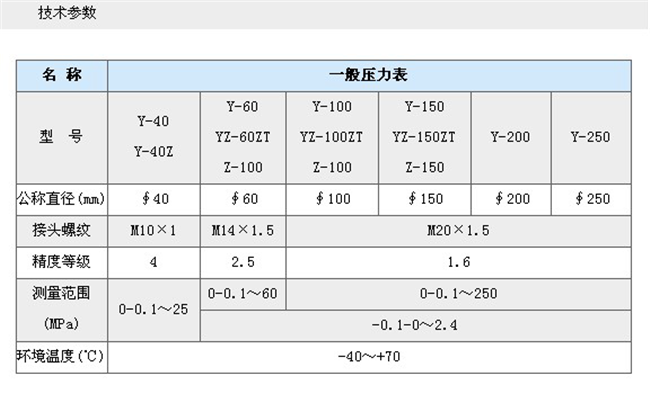 一般压力表以金属弹簧管作为压力敏感元件,适用于测量无爆炸危险、不结晶、不凝固及对铜和铜合金不起腐蚀作用的液体、气体和蒸汽等介质的正负压力。YC-60、YC-100、YC-150为船用压力表。